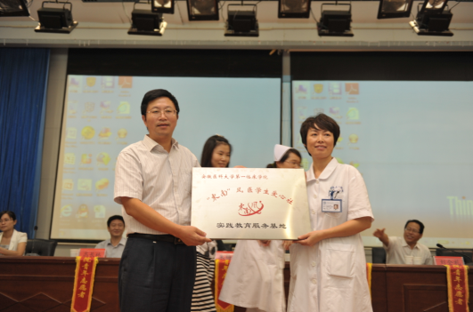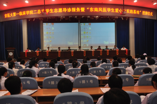 9月11日,医院在会议中心举行安医大第一临床学院第二党总支学生志愿导诊服务暨“东南风医学生爱心社实践基地”授牌仪式,校党委副书记刘群英、院党委副书记刘全礼等出席并讲话,校党委宣传部、学工部、团委、第一临床学院第二党总支及我院党委工作部、门诊部、团委等部门单位负责人出席,第一临床学院二总支2011、2012级本硕全体同学及辅导员近500人参加了仪式。仪式由院团委书记黄尧主持。