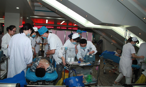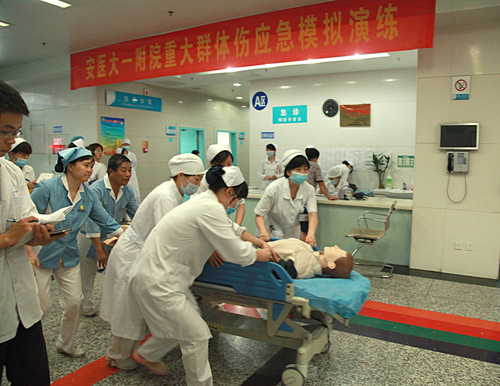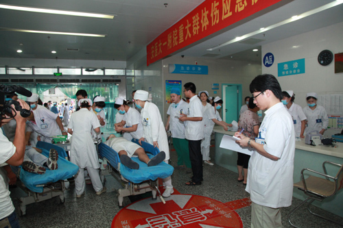 为了提升我院应急急救水平,8月3日下午5时,由医务处、急诊科牵头在急诊科大厅开展了院内重大群体伤应急模拟演练。院领导梁朝朝、余永强、金小干、费广鹤亲临现场观摩,演练由副院长费广鹤任总指挥。