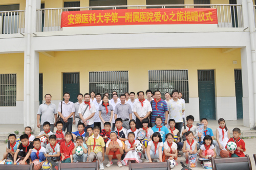 捐赠仪式上,校方向医院的大力支持表示由衷的感谢,少先队员为来宾们佩戴红领巾。刘全礼发表了热情洋溢的讲话,他首先感谢岗西小学的热情欢迎,向全校师生员工介绍了医院概况,介绍了医院长期以来秉承院训坚持开展公益活动。他代表医院鼓励同学们好好学习,快乐生活,欢迎同学们今后来安医大就读深造,来一附院发挥自己的聪明才智,为祖国医疗卫生事业贡献力量。最后,他祝愿同学们度过一个愉快、平安的暑假假期。安徽卫视公共频道“新闻第一线”栏目组还对此次活动进行了全程报道,刘全礼、许杜娟接受了采访。(院团委)