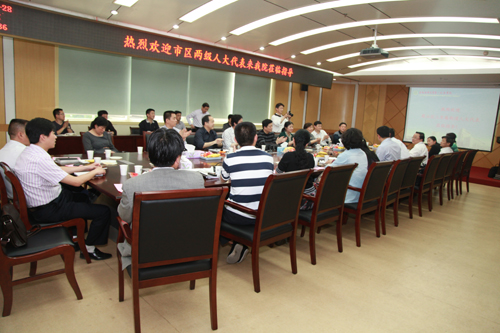 4月28日下午,合肥市及蜀山区两级人大代表莅临我院开展调研,通过座谈、走访等深入了解医院医疗现状和医院在发展中遇到的困难和问题。院长余永强、副院长金小干、鲁超及相关职能处室负责人参加了会议。 余永强院长在调研会上作了专题汇报,他介绍了医院近年来发展概况以及取得的成绩。同时恳请各位人大代表就绩溪路的交通、治安、摆摊设点问题进行关注和呼吁。