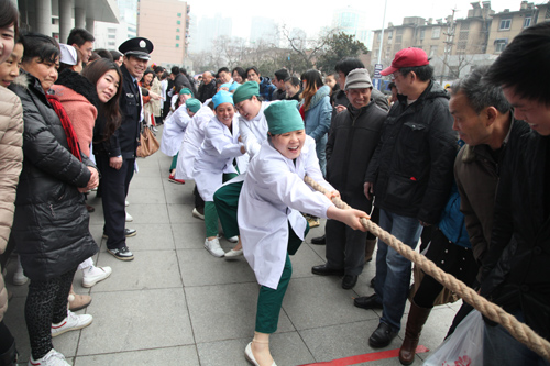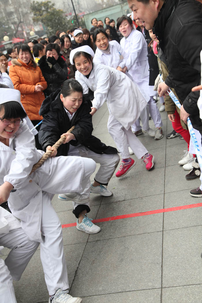 3月7日下午,在第102个“三八”妇女节到来之际,院工会组织3百余名女职工拔河比赛庆祝节日。“加油!加油!……”安医大一附院绩溪路门诊广场上正在举行紧张激烈拔河比赛,呐喊声、助威声、欢呼声此起彼伏,整个赛场沉浸在欢乐的海洋里。