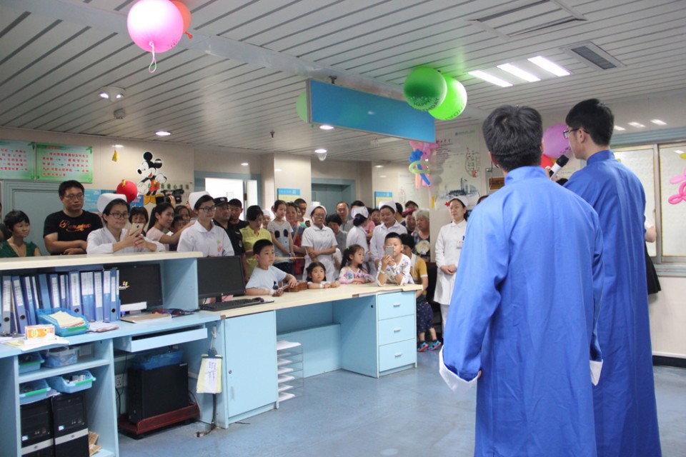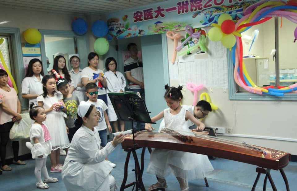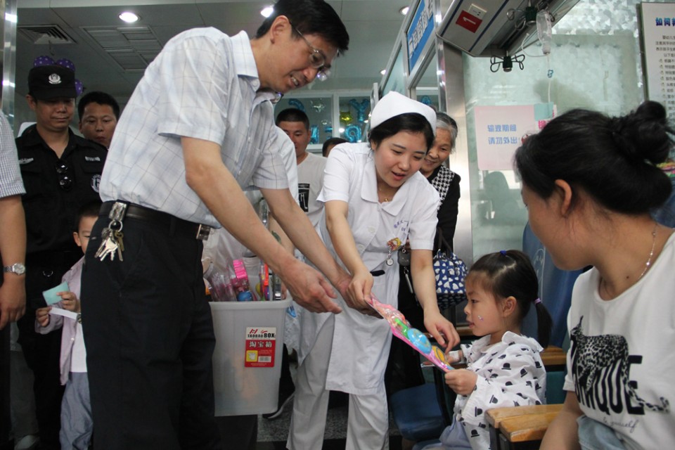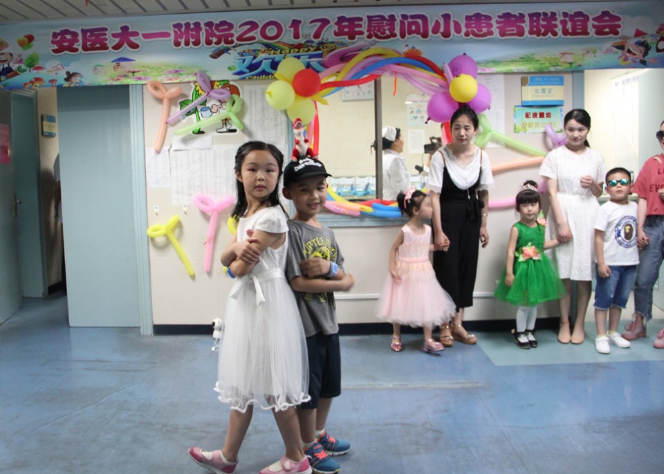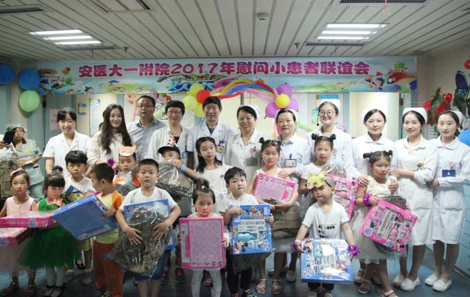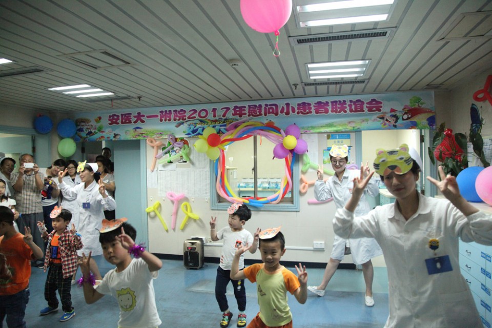 6月1日,医院举行庆祝“六一”儿童节慰问联欢系列活动,院党委副书记戴晓支为小患儿送上节日的祝福和礼物,与他们共同联欢,共度节日。 医护人员用气球、彩带精心将内科20楼儿科二病区装饰得充满了童趣,处处洋溢着节日的氛围,许多患儿及家长早早就守候在护士站外,等待着儿童节联欢活动的开始。儿科团员们亲手制作了可爱的节目道具,带领小患儿们表演了精彩的《虫儿飞》、《两只老虎》、《T台秀》,欢快的乐曲、童真的动作、天真的表情,博得观众的喝彩与掌声。职工子女小朋友也为小患儿们表演了自己的拿手绝活,用自己的方式陪伴他们欢度“六一”。院团委还邀请了来自安徽医科大学的学生文艺志愿者们,为小患儿们献上了舞蹈、朗诵、歌曲、相声等节目。活动现场精彩纷呈,小朋友们热烈地回应着,病房里的欢声笑语传递着爱和欢乐,孩子们脸上露出了幸福的笑容。节目最后,还向参加演出的小朋友们分发礼物,祝贺节日。