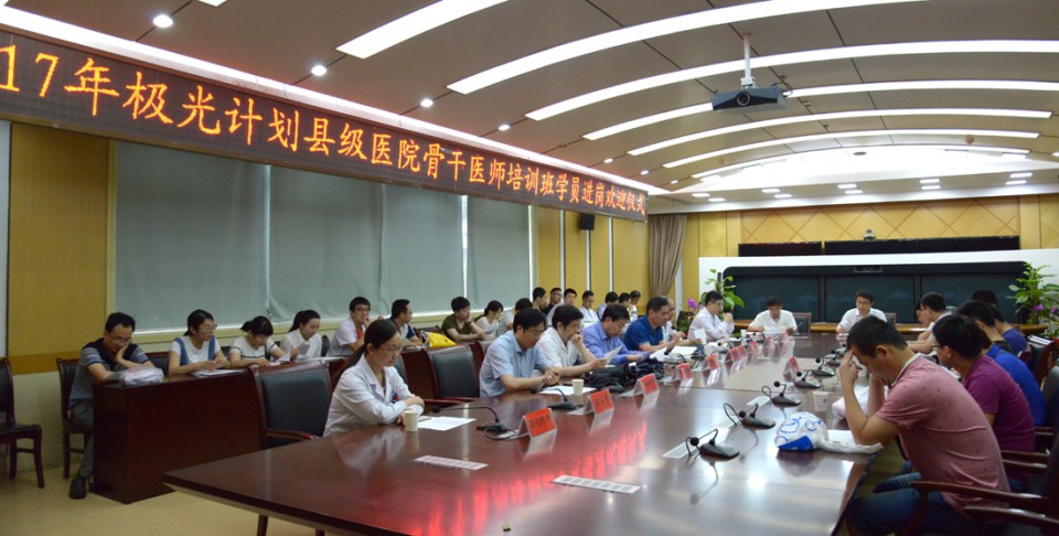 6月5日上午,我院在干部病房二楼会议室举办2017年极光计划县级医院骨干医师培训班学员进岗欢迎仪式,副院长费广鹤出席会议并讲话,呼吸内科、心内科、儿科、泌尿外科和消化内科的科室主任或带教老师以及来自8个县级医院的40名学员参加了会议,会议由医务处负责人黄志勇主持。 副院长费广鹤代表医院对40名学员来院交流学习表示欢迎,他指出按照省卫计委统一安排,今年是我院第二年承办该项目,去年学员们都满载而归,取得了很好的学习效果,今年我们结合大家前期提出的学习需求,也做了精细安排,指定了带教老师,大家都是医院业务骨干,希望大家能够遵守医院和科室规定,在带教老师指导下,认真学习,获得理想的学习效果。