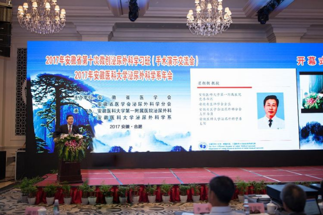 14日晚,安徽省医学会泌尿外科学分会举办了安徽省卫生计生适宜技术(泌尿系结石微创治疗技术)学习班的开班仪式。15日早上8:00,“2017年安徽省第十次微创泌尿外科学习班(手术演示会)暨2017年安徽医科大学泌尿外科学系年会”拉开了序幕,会议由安徽省医学会泌尿外科学分会秘书郝宗耀教授主持,首先由安徽省医学会泌尿外科学分会主委梁朝朝教授致欢迎词并对会议做简单介绍,本次学习班内容丰富,涵盖了当前泌尿外科微创技术等各个方面,共安排24台手术演示,通过光纤实时转播,主会场同时呈现普通视频与3D手术视频,并可在手术过程中与术者进行实时语音交流。此外,所有的会议内容都进行了网络同步直播。安徽医科大学分管校长朱启星教授发表了讲话,充分肯定了我院泌尿外科在学科建设、技术推广等方面取得的成绩。