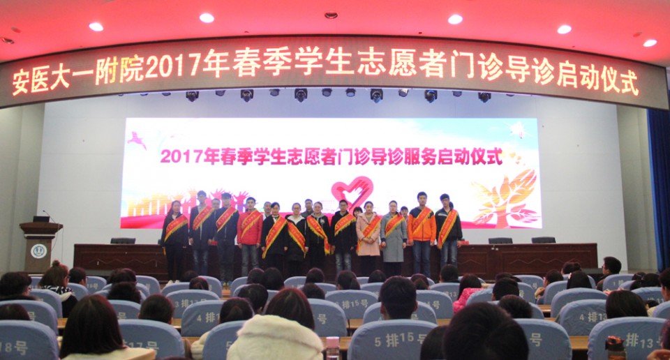 3月20日,医院举行2017年春季公共卫生学院学生志愿者门诊导诊服务启动仪式。公共卫生学院党委书记宋玉梅、一附院院党委副书记戴晓支出席会议并讲话。公卫学院党委副书记何婷婷、团委书记王晶晶及公卫学院400余名学生志愿者参加会议。门诊部主任李维荣致欢迎词,院团委书记黄尧主持会议。戴晓支代表医院欢迎各位同学积极踊跃加入医务志愿服务,将医务志愿服务及志愿者精神不断发扬光大。他指出,医务志愿服务是我院团委的一项品牌活动,受到社会各界和上级主管部门的关注和大力支持。他希望同学们安排好学习和志愿服务的时间,做到“两不误、互促进”,他还对做好志愿服务工作提出了几点要求,一是要培育志愿服务文化;二是要乐于奉献,用心打造安医名片;三是要善于创新,努力发挥青年优势。