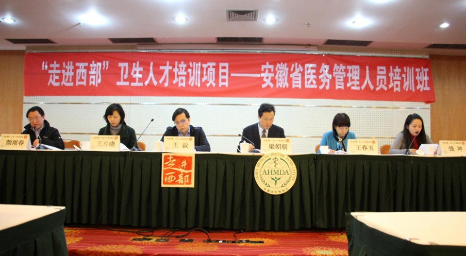 3月29日,由国家卫生计生委和安徽省卫生计生委主办,安徽省医师协会承办,国家卫生计生委医院管理研究所协办的“走进西部”卫生人才培训项目—安徽省市县医院医务管理人员培训班在合肥举行。省医师协会会长、院党委书记梁朝朝教授、国家卫生计生委医政医管局医疗资源处王毅处长、省卫计委医政医管处王卉晓处长、国家卫生计生委医院管理研究所王春玉主任出席开班式并作重要讲话,来自全省16个市,62个县(市)的170余名医务工作者参会。开幕式由省医师协会秘书长颜雨春教授主持。 梁朝朝会长代表省医师协会致欢迎词,并介绍了省医师协会今年的工作任务。国家卫生计生委医政医管局医疗资源处王毅处长在讲话中对我省深化医改取得的成绩给予充分肯定,希望我省能继续深入学习贯彻全国卫生与健康大会精神,进一步创新工作思路,统筹谋划,全面推进各项改革政策的落实。省卫生计生委医政医管处王卉晓处长首先代表卫生计生行政部门对协会为此次培训班所做的工作表示感谢,并要求所有参加培训的学员们珍惜此次交流的机会,能学有所获、学有所成,使培训工作收到预期的效果。