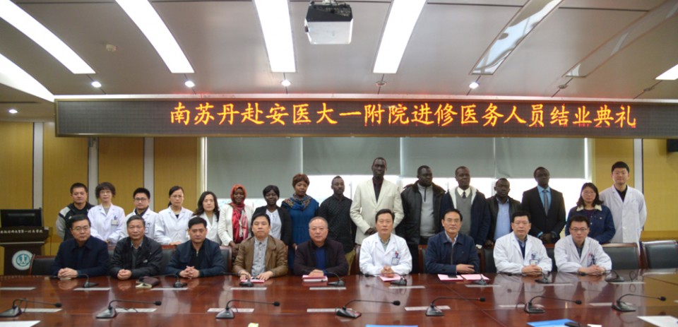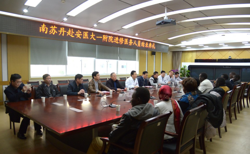 2月15日上午,医院在干部病房二楼会议室举行了南苏丹研修医务人员结业典礼,党委书记梁朝朝主持了会议,院长余永强出席了会议并致辞,省卫计委援外办负责人杜昌勇以及院办、医务处和相关临床科室负责同志及带教老师参加了会议。 院长余永强首先向南苏丹学员圆满完成学业表示祝贺,对学员们取得的成绩表示了满意,希望他们在回国后将所得所学服务于自己祖国人民。随后,南苏丹学员大卫代表全体学员对省卫计委和我院表达了感谢,并表示在院研修期间,虽然语言不通等障碍,但在医院的大力协助下,克服难处,一心求学,这段经历使他们回国后在临床工作中受益匪浅。省卫计委援外办负责人杜昌勇对学员们的优秀表现表示了赞扬并祝贺他们顺利结业,希望学员们在回国后做起中南两国友谊的桥梁,将两国之间友好邦交的传统延续下去。