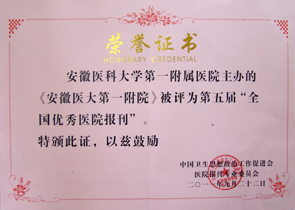 在刚刚结束的中国卫生政促会医院报刊专业委员会2011年度年会上,我院举办的院报《安徽医大第一附院》被评为第五届“全国优秀医院报刊”。这是我院连续第五次荣获该项荣誉。