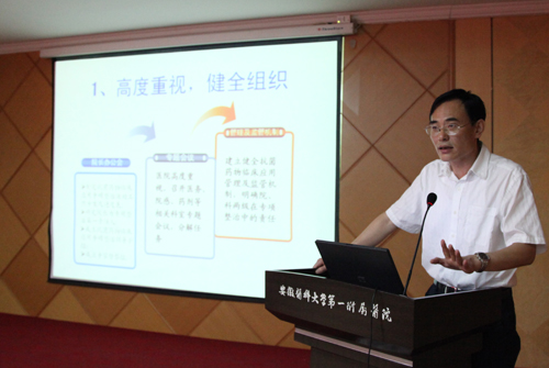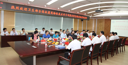 8月1日上午,卫生部全国抗菌药物临床应用专项整治督导检查组一行在省卫生厅医政处处长费勤福、副处长吴振宇等陪同下来我院督导检查。院领导梁朝朝、余永强、刘全礼、尹宗生、鲁超、费广鹤、李家斌及相关职能处室负责人在干部二楼会议室接待了检查组一行。副院长梁朝朝致欢迎辞,副院长余永强就我院开展抗菌药物临床应用专项整治工作进行了汇报。医院抗菌药物临床应用专项整治活动专家督查组全体成员参加了汇报会。