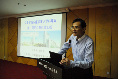 余永强副院长对我院近三年来省临床医学重点学科建设现状与成果进行了总结发言。他从我院12个相关学科的临床服务能力与技术水平,主要技术优势和特色,专业带头人水平及学科队伍建设,学科规模、环境条件及发展后劲与潜力,学科的管理和医疗技术服务的社会影响力和满意度5个方面分别进行了全面、细致的汇报、答疑。