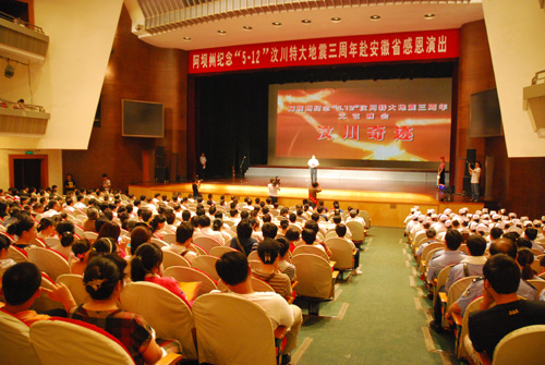 2011年7月8日晚,在院工会组织下,安医大一附院40名医护职工在安徽大剧院观看了阿坝州纪念“5.12”汶川特大地震三周年赴安徽感恩演出。医院副院长梁朝朝出席观看了演出。