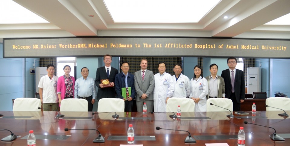 10月3日,在庆祝建校90周年国际教育交流与合作论坛中,院长余永强与德国汉堡大学罗腾堡教学医院Rainer Werther院长代表双方签署了国际合作协议。在我校及我院九十周年华诞之际,德国汉堡大学罗腾堡教学医院院长Rainer Werther教授和血管外科主任Michael Feldmann教授来我院参加庆典活动。9月30日上午,院党委书记梁朝朝、院长余永强及相关职能处室负责人等在行政楼第二会议室亲切会见德国专家。会议由金小干副院长主持,在会谈中,梁朝朝书记首先对两位德国专家的到来表示了热烈的欢迎,接着向德国客人介绍了我院的历史和发展情况以及近年来取得的成绩。院长余永强表示感谢的同时就进一步加深两所医院之间合作的提出了希望。德国专家对我院的热情接待表示感谢,同时简要介绍了汉堡大学罗腾堡教学医院的概况,回顾了我院血管外科与罗腾堡医院血管外科近年来的合作情况,希望未来能在多个领域与我院进一步加强合作。