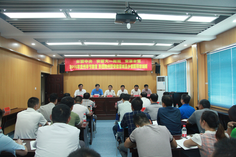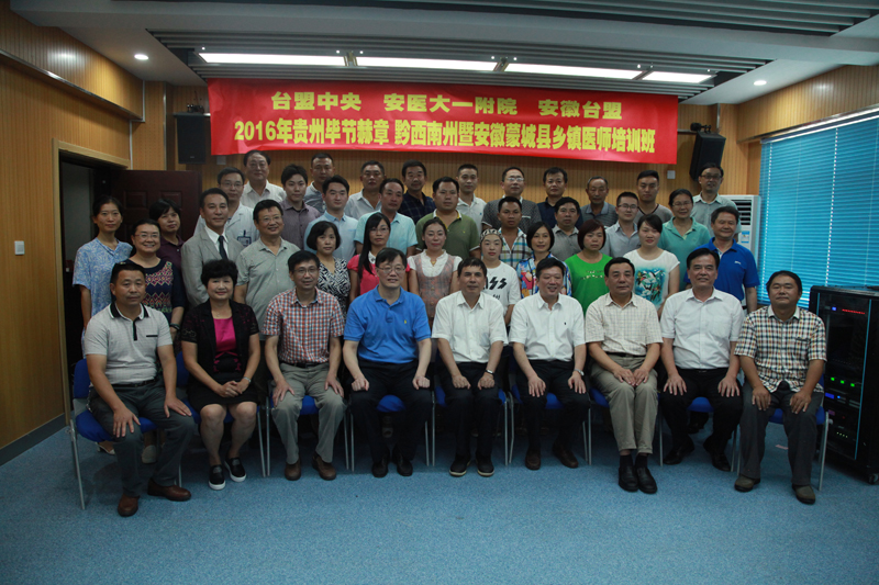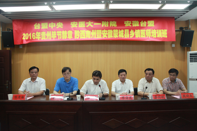 8月27日下午,由我院和台盟中央、安徽台盟联合举办的2016年贵州毕节赫章、黔西南州、安徽蒙城乡镇医师培训班正式开班。台盟中央副主席杨健、安徽省委统战部副部长陈昌虎、安徽医科大学党委书记李俊、安徽省台盟总支委员会主委陈清海、医院党委副书记戴晓支等领导出席了开班仪式。台盟中央社会服务部部长蔡国斌主持开班仪式。来自贵州毕节赫章、黔西南州、安徽蒙城共20名乡村医师参加了本期培训。