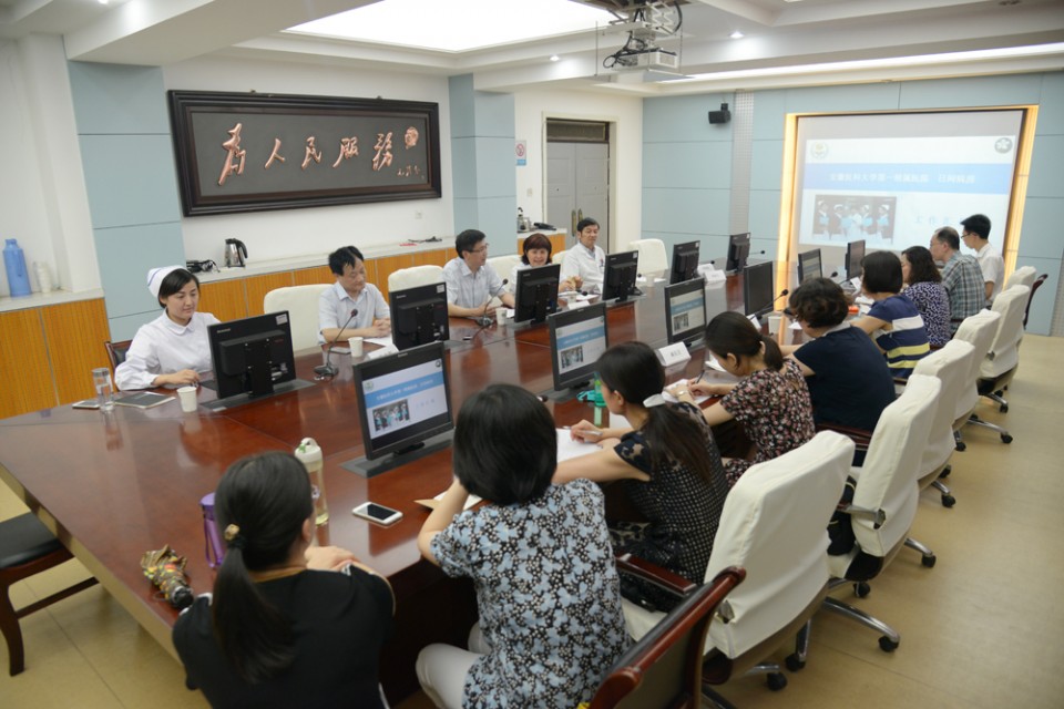 戴晓支副书记首先对山东省社保处及兄弟医院来我院考察交流表示欢迎,并向来宾简要我院发展历史及专科特色。随后,顾康生、张帆、张海燕、陈光辉分别就我院的肿瘤日间病房的设置、医疗护理管理、医保政策的执行等方面进行了全面细致的介绍。会上,双方就日间病房患者的收治、入院后的管理、病历的书写归档、医保报销等内容进行了深入探讨和交流。徐悦处长说,安医大一附院肿瘤日间病房的设立创新了医保管理模式,运行良好,实现了“医院、医保、患者”三方共赢的局面,为这项工作的推广提供了宝贵的经验,此次考察学习收获不少。