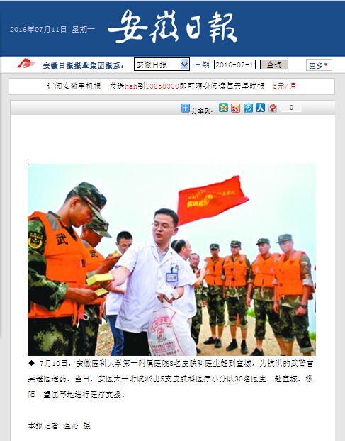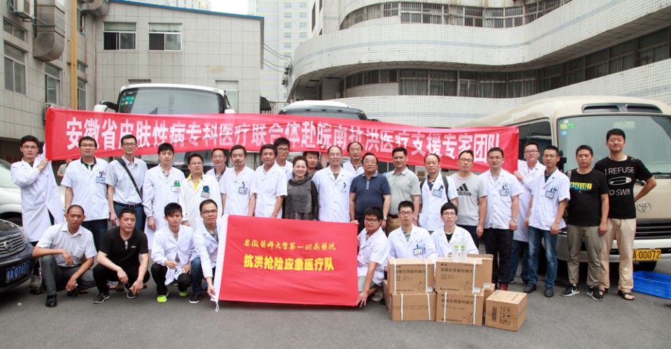 按照省卫生计生委统一部署,7月10日上午,我院组织四支专科医疗小分队,分别由皮肤科张安平、林国书、周文明、王再兴、张学军等专家带队,由皮肤科博士硕士研究生组成小分队(每队4-6人),赴宣城、无为、枞阳、望江、宿松洪涝灾区慰问抗洪救灾部队官兵、发放常见皮肤病药品。据专家介绍,救灾部队因为长期风吹日晒被水浸泡,皮肤病发病急聚上升,多发生晒伤、擦伤,夏季皮炎、湿疹、手指足趾间浸渍,间擦皮炎,真菌感染,细菌感染,肠炎等。医疗队为抗洪官兵送去了扑粉、炉甘石洗剂、创可贴、防晒霜、保湿霜,抗真菌、抗细菌外用药膏,抗炎激素制剂等常见药品。