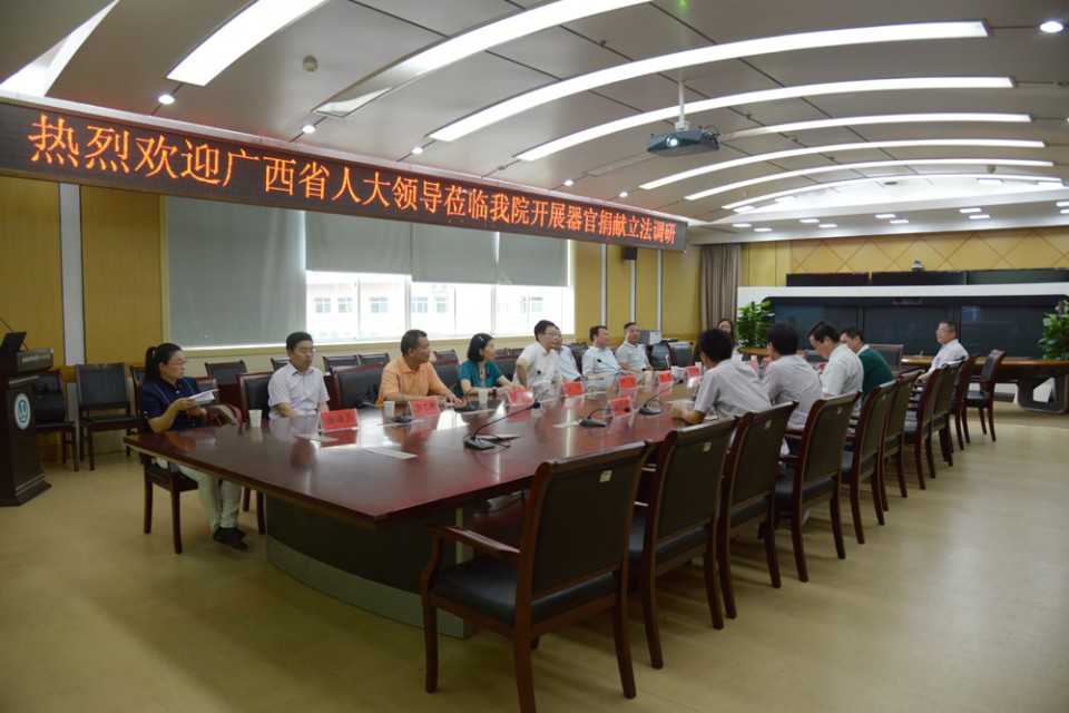 6月21日上午,广西壮族自治区人大教科文卫副主任委员梁颖一行来我院调研器官捐献立法工作开展情况,安徽省人大教科文卫工委副主任辛生及省红十字会事业发展部张本该部长陪同调研。党委书记梁朝朝、医务处负责人黄志勇及OPO团队相关人员参加了对接会议。梁朝朝书记对广西人大一行来我院调研表示热烈的欢迎,并简要介绍了我院的基本情况,并强调了移植工作在医院各项工作中的重要地位。器官移植中心赵红川副主任医师向与会人员介绍了我省以及我院器官捐献与移植工作的开展情况。随后,调研组实地参观了器官移植中心和OPO办公室。
