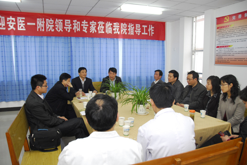 为认真贯彻《卫生部办公厅关于印发2010年万名医师支援农村卫生工程项目管理方案的通知》,在省卫生厅的统一部署下,我院2011年万名医师对口支援农村卫生工程正式启动。4月12日,副院长费广鹤、医务处处长陈维华和医务处副处长夏海龙带队,将下乡队员送到了各个受援医院。共选派ICU、放射科、骨科、麻醉科、妇产科、胸外科等8名高年资副主任医师及主治医师分别对口支援岳西县医院和舒城县医院。