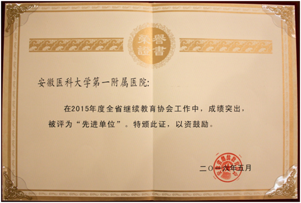 2016年5月27日上午,安徽省继续教育协会二届二次理事会暨会员大会在合肥召开,安徽省人社厅专技处处长罗志年、副处长何实、省继续教育协会理事长管阳等相关领导出席会议。会上,公布了2015年度安徽省继续教育20家先进单位名单,我院是其中之一。副院长王珩代表我院参加会议并接受先进单位荣誉证书。此次会议还总结了省继教协会2015年度工作,并对2016年的工作重点进行了部署。2015年,医院严格依照安徽省继续医学教育管理要求,充分发挥自身优势,坚持科学管理,规范化推进继续医学教育工作,完成的国家级、省级继续医学教育项目逐年增加,院内继教活动广泛开展,且措施具体,讲究落实,保证了项目的举办质量。医院建立了医院继续医学教育信息管理系统,由单一的评价式管理向更加科学和规范的训、考、用一体化模式转变。对医药护技专业人员继续教育实行分类管理,建立全员终身教育机制。
