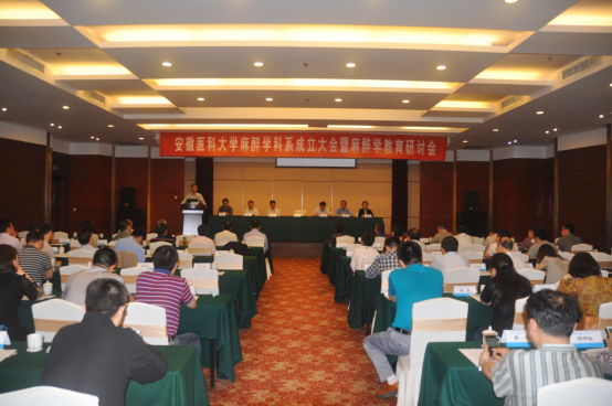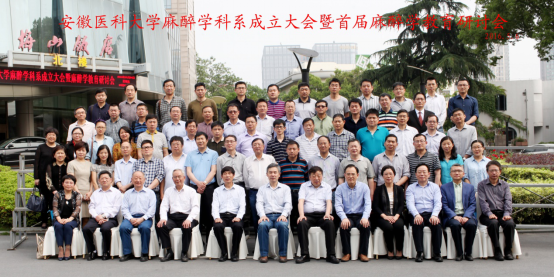 2016年5月6日上午,安徽医科大学麻醉学科系成立大会暨麻醉学教育研讨会在梅山饭店成功召开。副校长朱启星教授、医院管理处范自法处长,院长余永强教授、副院长王珩教授,中国高等教育学会医学教育委员会麻醉学高等教育理事会副理事长、华中科技大学协和医院副院长姚尚龙教授,徐州医科大学麻醉学院副院长张励才教授出席开幕式并合影纪念。开幕式由麻醉科李元海教授主持。