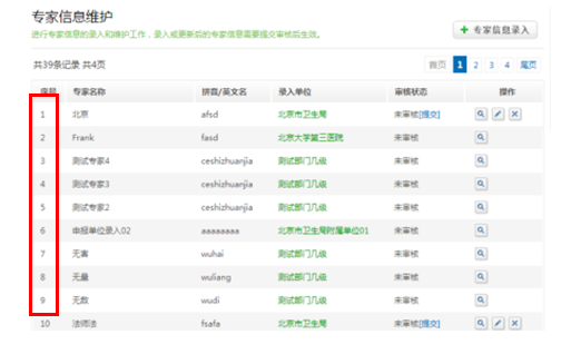 (红框里的序号即编号,上图表示已被使用的编号,请专家在录入信息前注意,接着之前已用编号往后编)