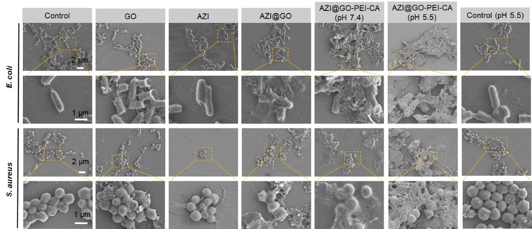 图3. AZI@GO-PEI-CA的抗菌活性。在pH 7.4和pH 5.5条件下,用PBS、AZI(5µg/mL)、GO、AZI@GO(100µg/mL,以GO表示)和AZI@GO-PEI-CA(100µg/mL)处理4小时后的细菌SEM图像,比例尺分别为2µm和1µm。