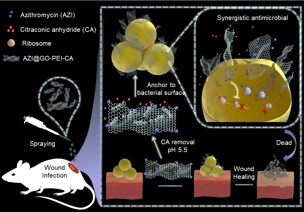 文章详细探讨了聚乙烯亚胺-甲基马来酸酐(PEI-CA)作为阳离子聚合物,修饰载有抗生素(阿奇霉素AZI)的氧化石墨烯纳米片AZI@GO,制备了一种协同抗菌剂AZI@GO-PEI-CA。利用CA与PEI伯胺基反应,使其在中性环境下不带电荷,极大的提高材料的生物相容性。利用在酸性条件下CA被去除,使抗菌纳米片呈现正电荷,增强了对细菌膜表面的锚定,通过GO在细菌膜表面的物理切割以破坏细菌膜完整性发挥杀菌作用,同时协助抗生素进入细菌内部发挥抑菌作用。因此,PEI-CA,AZI和GO在AZI@GO-PEI-CA纳米材料中的协同作用可以有效地杀死细菌,这种具有协同抗菌机制的多组分抗菌剂在细菌感染的治疗中非常有前途。