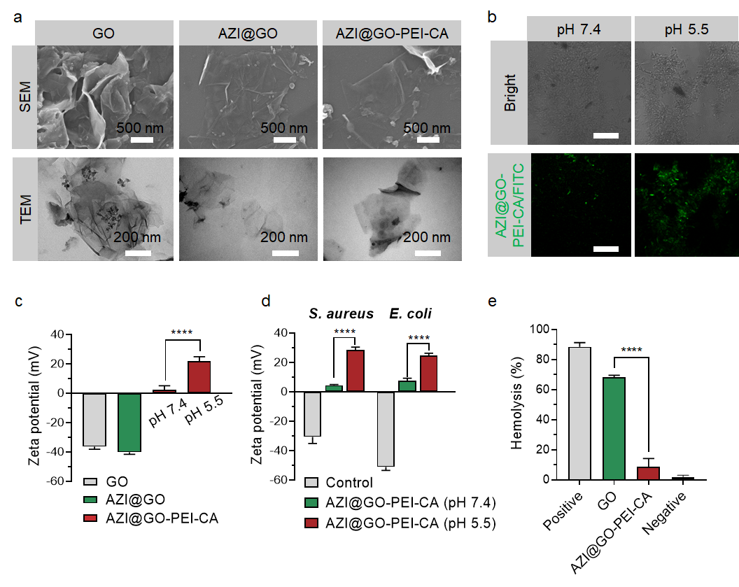图2.AZI@GO-PEI-CA的形貌、酸活化的材料表面正电荷密度增加以及细菌膜锚定。(a)GO,AZI@GO,和AZI@GO-PEI-CA的代表性SEM和TEM图像;(b)AZI@GO-PEI-CA的酸活化细菌膜锚定行为。绿色代表FITC荧光,比例尺为50µm;(c)在pH7.4和pH5.5的PBS中GO,AZI@GO和AZI@GO-PEI-CA的Zeta电位;(d)AZI@GO-PEI-CA处理2小时后,金黄色葡萄球菌或大肠杆菌的Zeta电位;(e)GO和AZI@GO-PEI-CA对红细胞的溶血性评估。