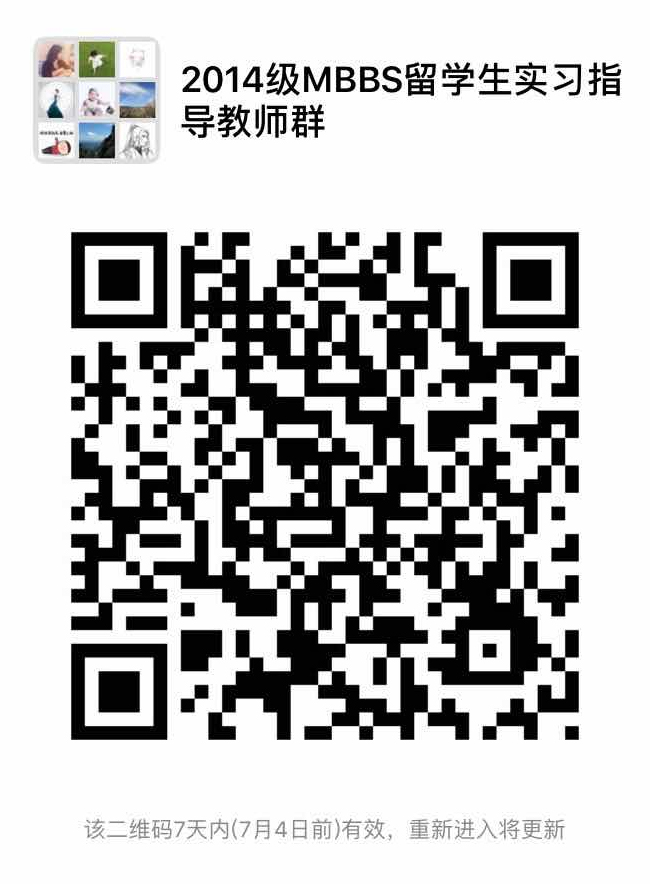 请各教研室根据轮转计划(附件2)和校外字〔2014〕21号《安徽医科大学来华留学生临床实习带教实施办法(试行)》(附件3),高度重视留学生临床实习任务,按照《安徽医科大学第一附属医院临床医学专业(全英文授课)留学生实习医生管理相关规定》(附件4)要求及临床医学专业(全英文授课)留学生实习注意事项(附件5)圆满地完成留学生实习带教任务。留学生实习指导教师职责请见附件3文件精神。2014级留学生实习指导教师请扫描下列二维码入群,便于统一管理!特此通知!