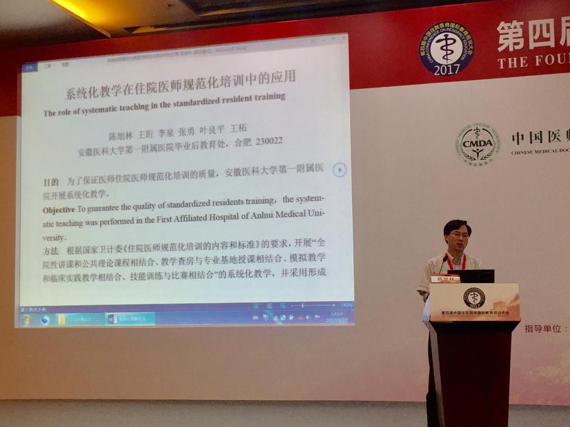我院由王珩副院长带队共有8位住培专家参会,大会从来自全国的数百篇教学论文中评出6篇优秀论文,我院毕业后教育处陈旭林处长的《系统化教学在住院医师规范化培训中的应用》和张勇科长的《安徽省住院医师规范化培训师资培训的实践与思考》两篇论文均荣获优秀论文奖,陈旭林处长在大会上进行了以“创新住培教学和师资培训模式”为主题的学术交流活动,获得了与会专家的肯定和好评。