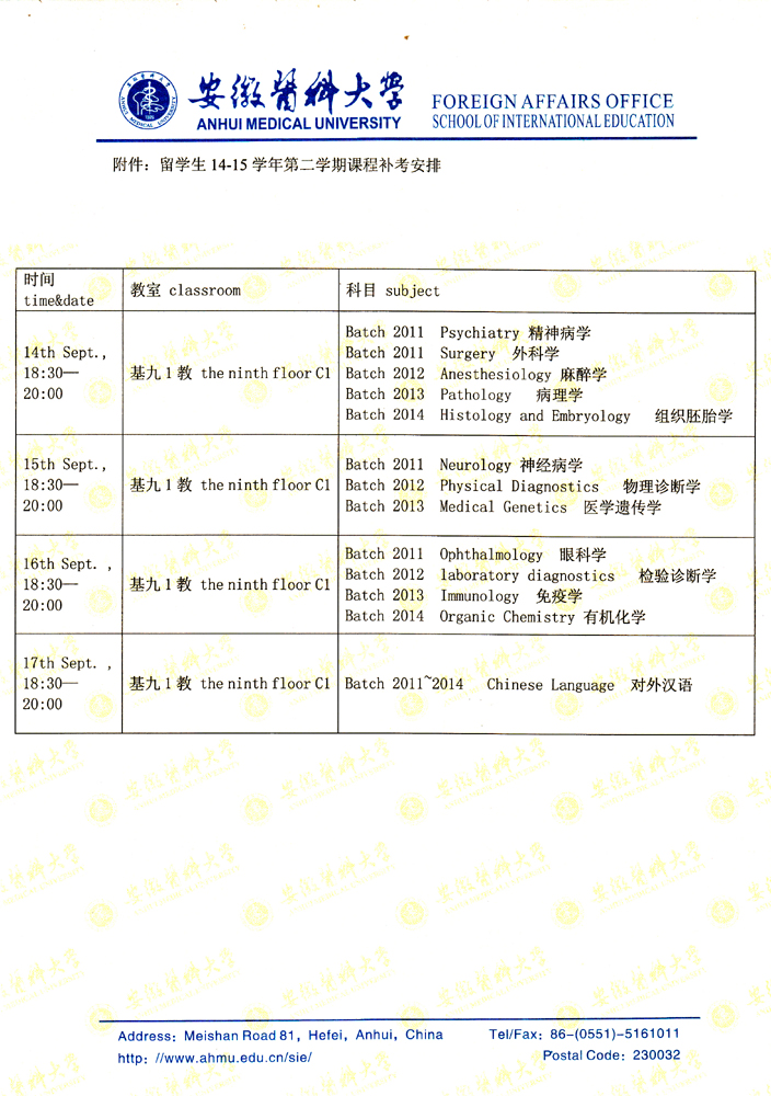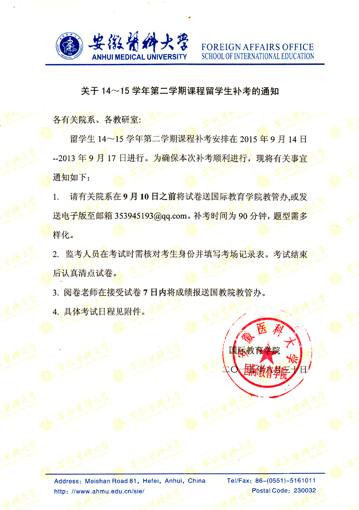 各教研室: 附件是2014-2015学年第二学期留学生补考通知及具体安排。请按照通知要求完成补考任务!特此通知。