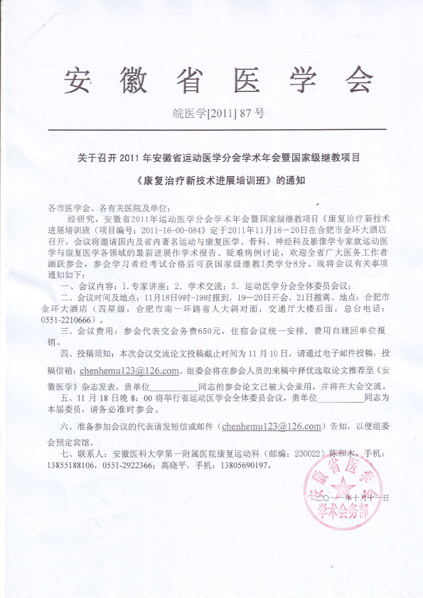 安徽省运动医学分会学术年会暨国家级继教项目《康复治疗新技术进展培训班》的通知