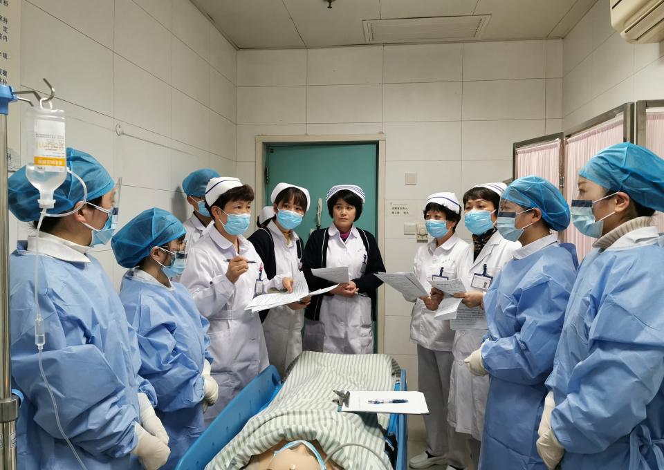 演练过程按既定方案进行,急诊科接到模拟120电话,绕城高速发生重大道路交通事故造成大批群发伤“患者”来我院亟待救治,其中包括一名从武汉来的发热、疑似新型冠状病毒肺炎“患者”。急诊科护士迅即逐级汇报,护理部立即启动紧急状态下护理人力资源应急预案。演练环节包括:信息接收上报、应急响应、伤员交接抢救、患者分流等。由急救经验丰富的科护士长、护士长和专科护士组成应急演练小组,组织调配16个病区不同层级的应急护理人员参与救治。应急人员在指定时间内携带相应急救仪器设备到达演练现场,现场以4人为单位迅速组成一个应急演练小组,结合脑出血伴颈椎损伤、多发伤、疑似新型冠状病毒肺炎、急性心力衰竭等情景案例模拟抢救。参与演练护士能够准确判断患者存在的主要护理问题,采取正确的护理措施,并迅速成立以N4护士为急救组长的团队分工配合,对模拟对象进行紧急救治。