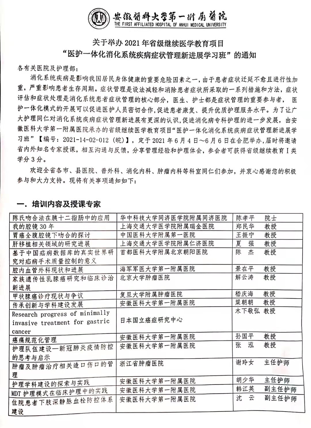 消化系统疾病是影响我国居民身体健康的重要危险因素之一,由于患者症状迁延不愈且进行性加重,严重影响患者生存周期。症状管理是设法减轻和消除患者症状所采取的一系列措施和方法,症状评估和症状处理是消化系统患者症状管理的核心部分,医生、护士都是症状管理的重要参与者, 医护一体化模式的开展可以促进医护人员密切合作,促进患者康复、提升优质护理服务水平。为了让广大护理同仁对消化系统疾病症状管理新进展有更深的认识,促进消化病专科护理的进一步发展,由安徽医科大学第一附属医院承办的省级继续医学教育项目“医护一体化消化系统疾病症状管理新进展学习班”【编号:2021-14-02-012 (皖)】,定于2021年6月4日~6月6日在合肥举办,届时将邀请省内外知名专家授课,相互沟通与反馈,分享管理经验和护理体会,参会者可获得省级继续教育Ⅰ类学分3分。