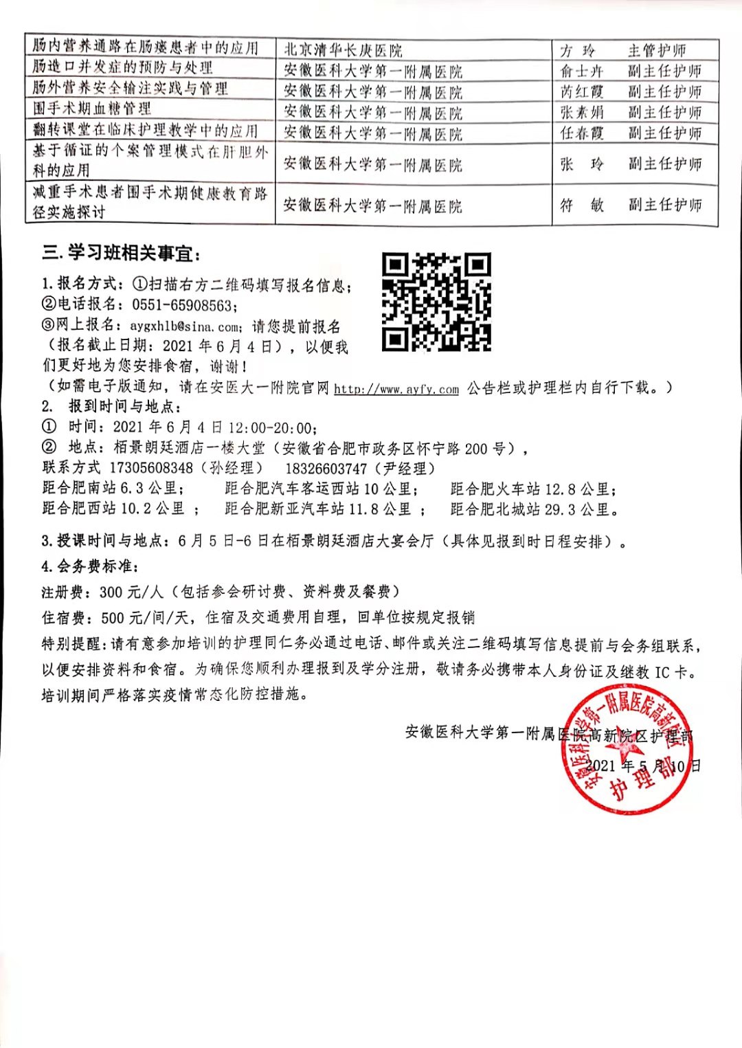 特别提醒:请有意参加培训的护理同仁务必通过电话、邮件或关注二维码填写信息提前与会务组联系,以便安排资料和食宿。为确保您顺利办理报到及学分注册,敬请务必携带本人身份证及继教IC卡。培训期间严格落实疫情常态化防控措施。