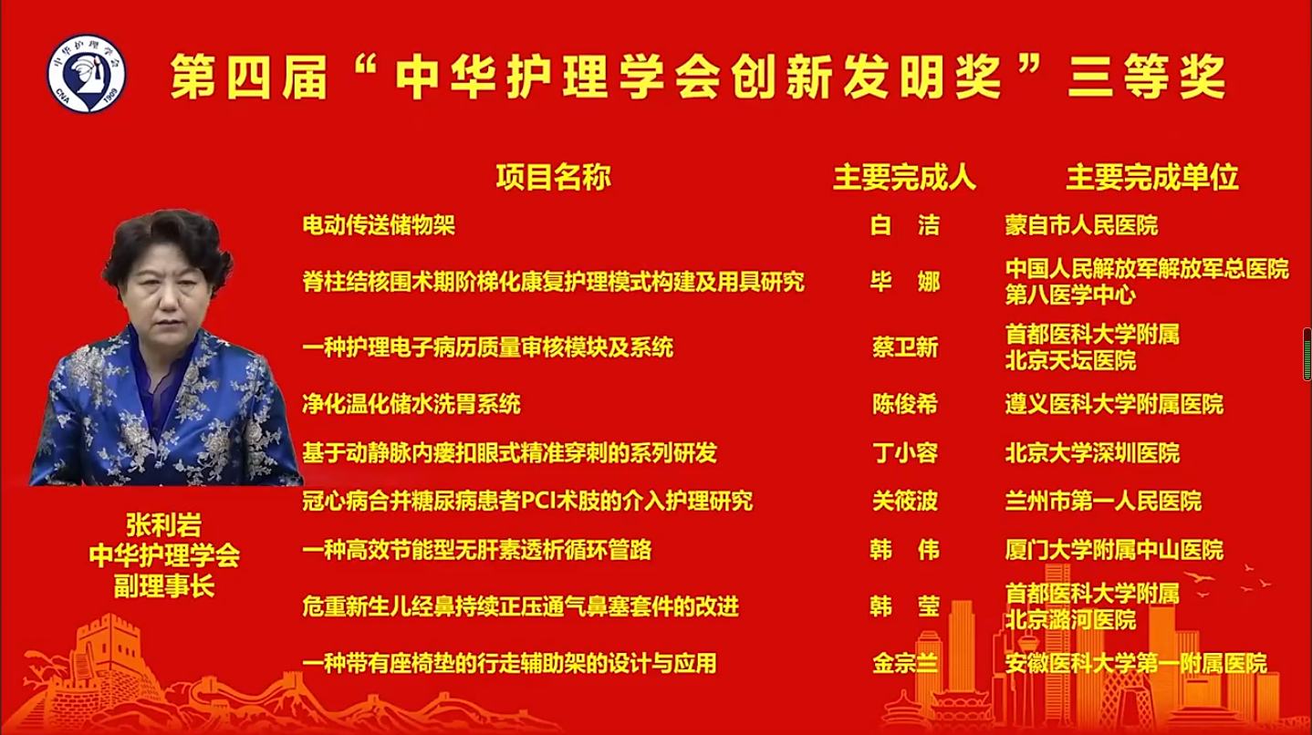 11月18日,中华护理学以线上形式召开以“学习二十大,领航新征程”为主题的全国第十二届护理学术年会,会上表彰了第四届“中华护理学会创新发明奖”获奖项目。中华护理学会理事长吴欣娟、国家卫生健康委医政司司长焦雅辉、中国科协科学技术创新部部长刘兴平、全国妇联妇女发展部部长邰烈虹致辞。本次创新发明奖全国共上报194项,经过初评、线上答辩、复评等严格评选,评出45项获奖项目,我院泌尿外科金宗兰护士长团队继2020年荣获此项奖项之后,今年以“一种带有座椅垫的行走辅助架设计与应用”再次荣获三等奖。