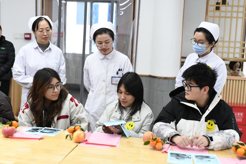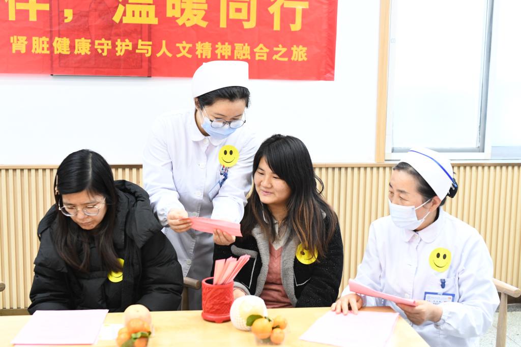 岁暮天寒,肾情不减。医院始终将人文关怀作为高质量发展的核心动力,护理部持续深化“人文示范单位”与“人文示范岗”建设,营造温暖共情的照护文化。作为“一叶春晖”人文示范岗,肾脏内科不断将制度转化为行动,将理念沉淀为温度。活动在护理人员的细致筹备与温暖问候中开始。护士长程光敏在表示,每一次相聚都不仅是知识的传递,更是生命的陪伴。我们希望以专业为基石,以人文为纽带,与肾友并肩前行。随后的环节精心融入人文内核。“微笑接力”用无声的祝福联结彼此;“手工签筒”在书写与传递间寄托祈愿;“精准投喂”游戏让饮食管理成为可触摸的日常智慧;“耳朵SPA与轻拍操”则借助中医舒缓之力,引导身心放松。这些看似简单的互动,实则是将护理从“技术操作”转向“全人关怀”的实践——它们帮助患者重拾对日常生活的掌控感,在疾病的不确定中找到一份确定的温暖与支持。最后,在《只要天天开心就好》的合唱声中,护理团队送上承载平安祝福的爱心礼包。