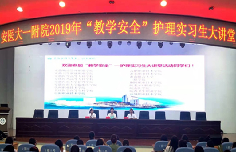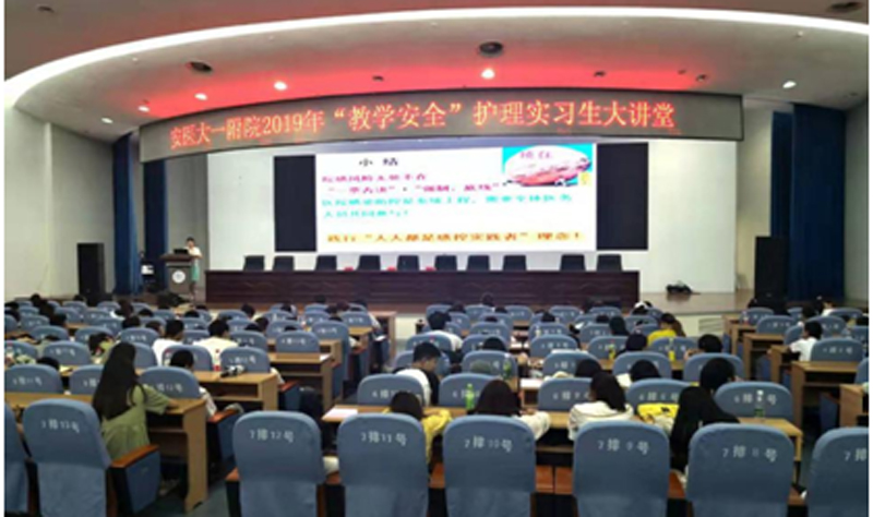 8月17日下午,我院护理部在内科医技楼四楼会议中心举办主题为“教学安全--实习生大讲堂”活动,活动由护理教研室张标新副主任主持。护理教研室丁萍主任致辞,护理教研室丁金霞副主任参加开幕式,来自省内外共18家院校的全体护理实习生共800余人参加。开幕式上,教研室丁萍主任在致辞中对本次活动的目的和意义进行阐述。为了增强实习生的护理风险意识,有效规避实习中可能产生的护理隐患,在保证自身安全的同时为患者提供安全、优质的护理服务,营造医院安全文化氛围,我院护理部护理教研室把安全文化教育纳入护理实习生常规培训内容。本次活动先后安排了护理教研室丁萍主任的《医院感染控制与安全》,泌尿外科三病区宋真护士长的《情绪与安全》,夜查房程金贵护士长的《核心制度与安全》、 教研室张标新副主任的《沟通与安全》、教研室丁金霞副主任的《静脉治疗与安全》及高新重症监护室方业香护士长的《职业防护与安全》等课程。6位临床资深护理专家多形式、多角度为同学们带来精彩纷呈的知识讲座。同学们纷纷表示听了老师们的讲座受益匪浅,此次活动非常适用、非常有必要,对实习阶段及未来的职业生涯有着深刻意义。