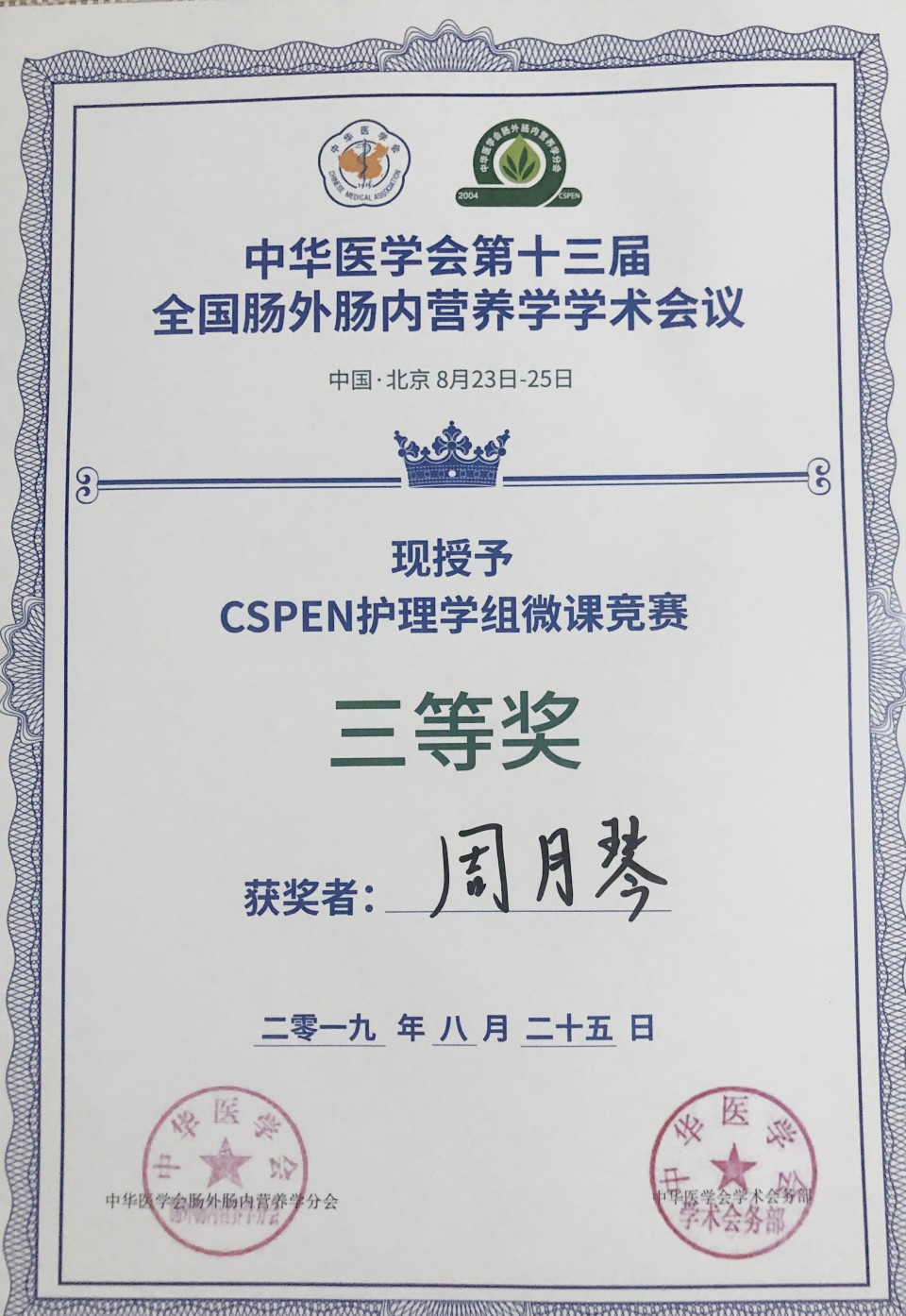在营养护理论坛的护理人员肠内营养培训PPT竞赛专场中,全国各省市经过层层评比,最终有21家单位参加此次比赛。经过现场专家精心评比,我院神经内科护士周月琴的参赛视频《ICU患者肠内营养并发腹泻的护理管理》荣获肠外肠内营养学学术会议护理学组微课竞赛三等奖。