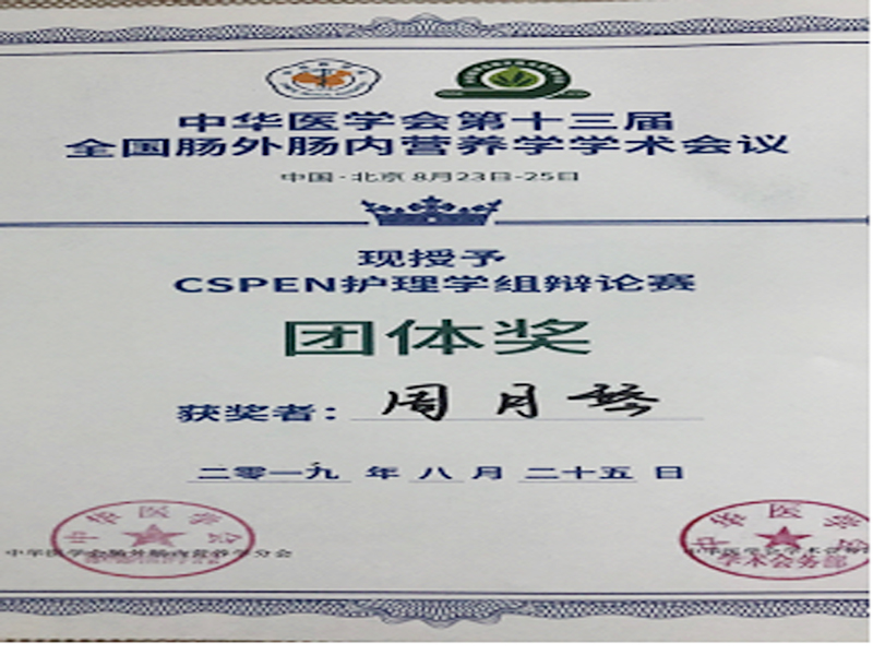 8月22至25日,由中华医学会、中华医学会肠外肠内营养学分会主办,首都医科大学附属北京世纪坛医院协办的中华医学会第十三届全国肠外肠内营养学学术会议在北京举行。大会以落实“营养,一线治疗”为学术重点,以“领航营养,健康中国”为理念,分设危重症营养论坛、神经疾病营养论坛、营养护理论坛等专场。在营养护理论坛的辩论赛专场,以“是否支持护士主导营养治疗”的辩题中,我院神经内科ICU护士周月琴作为正方一辩辩手,在经过立论陈词、攻辩、自由辩论、总结陈词等环节,最终正方战队获得肠外肠内营养学学术会议护理学组辩论赛团体奖。