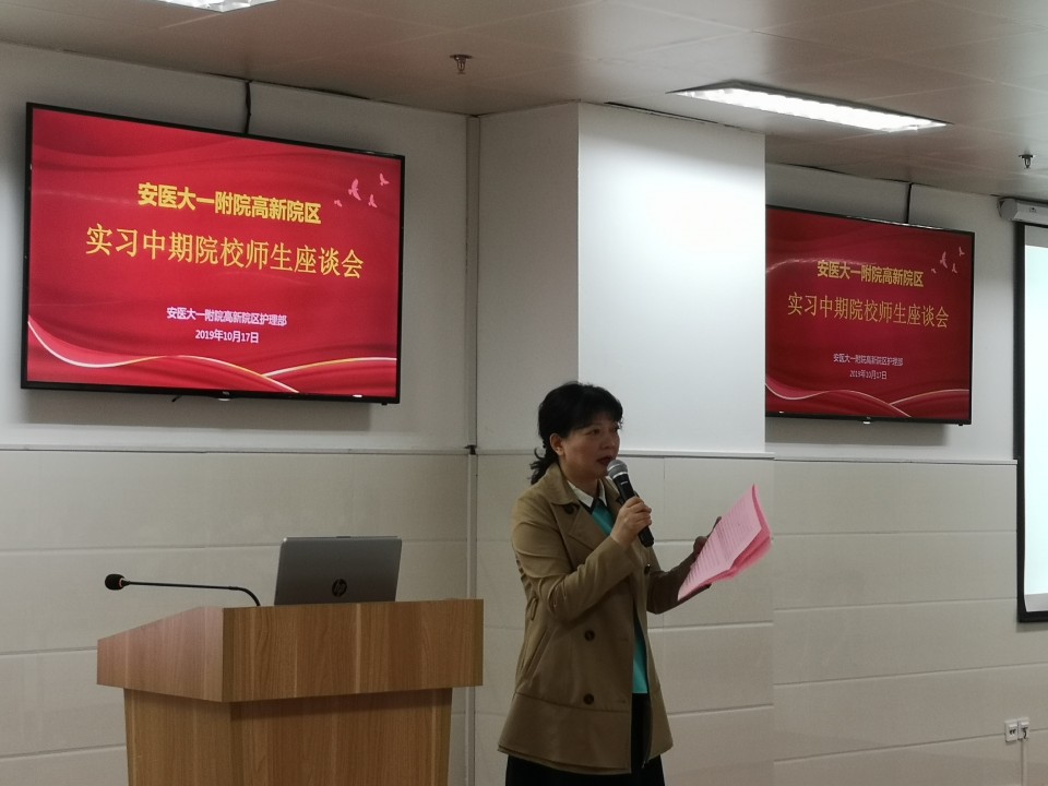 会议由高新院区护理部副主任韩江英主持,护理教研室主任、感染管理科主任、丁萍致欢迎辞,教研室副主任丁金霞对院区护理和临床护理实习教学工作进行了汇报。随后,实习生代表分别就实习期间的学习情况和参加“护患体验”的心得进行了发言。实习是他们职业生涯中的起始也是尤为关键的一环,以积极的心态,将理论与临床实践相融合,才能巩固专业知识;护患体验促使了她们站在病人的角度思考,医护人员该如何去满足以病人需求为导向来改善患者的就医感受。临床护理教学老师代表陶晓燕对实际带教中如何授业解惑、言传身教进行了精彩讲述。来自安徽医专的王齐主任则从实习生管理的角度,对如何开展院校联合、齐抓共管进行了宝贵经验分享。最后,师生座谈交流环节,学校老师、临床带教老师、实习同学分别围绕院校之间的教学合作交流、临床护理带教思路的探索、实习生在临床学习中的所学所感、就业的感触等多个方面展开研讨交流,现场气氛热烈。