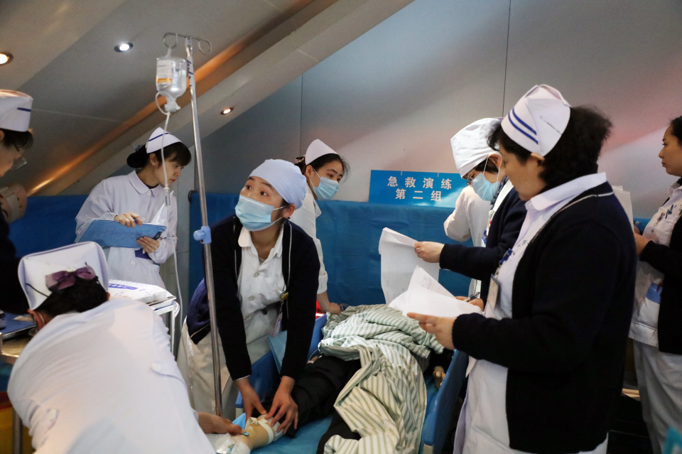 演练从急诊科接到模拟120电话开始,某大型化工厂车间粉尘起火爆炸造成大批群发伤患者来我院亟待救治,与此同时本院门诊一位患者突发病情变化急需抢救,急诊科护士迅即逐级汇报,护理部立即启动紧急状态下护理人力资源应急预案。现场模拟案例包括:颅脑外伤伴颈胸椎损伤,全身多发伤,爆炸伤致急性呼吸衰竭,急性前间壁心肌梗死,演练环节包括:开通绿色通道、人员调度、物资调配、抢救处置、院内转运、护患纠纷处理等。参演护士反应敏捷、分工明确、流程合理,能够准确判断患者存在的首优护理问题和潜在并发症,采取正确的抢救及护理措施。