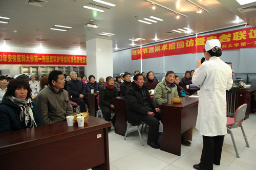 1月20日上午,护理部本着护理工作“三贴近、六满意”即贴近患者、贴近临床、贴近社会,让患者满意、社会满意、政府满意、护士满意、医生满意、医院满意的原则,在门诊3楼健康宣教室召开“髋关节置换术后回访暨患者联谊会”。我院数名骨科专家、护士和众多患者及其家属参加了此次联谊会活动。联谊会上,我院专家和医护人员详细询问了每一位患者出院后的恢复情况,为他们仔细检查,并对患者提出的问题进行了耐心的解答。同时,护理部还为他们准备了术后康复指导相关的专题讲座,并与患者及其家属共进午餐,气氛十分热烈。