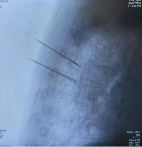 患者,女,53岁,甲状腺癌术后2年,胸4、5及腰2椎体多发骨转移,胸背部无法药物控制的疼痛,即将病理性骨折。胡勇教授团队将MRI、3D-CT及PET-CT图像融合数据输入手术机器人进行精准规划设计,同步完成了3椎体的微创杂交手术,手术历时55分钟,术后无神经损伤并发症发生,患者疼痛消除,术后第二天即可下地行走。