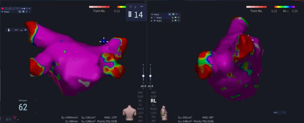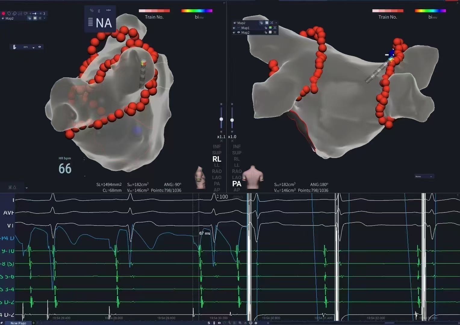 本次手术喻荣辉教授采用脉冲电场环形导管实现“零射线”心脏三维建模与基质标测。在精准定位异常电信号区域后,使用脉冲压力导管实施逐点消融。相较于传统射频消融,此次手术不仅完全避免辐射暴露,更通过优化的能量递送模式显著降低组织损伤风险。该手术的顺利成功完成为全程“零射线”下应用PFA技术治疗心房颤动提供了全新范本。
