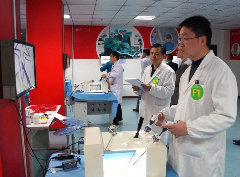 “安徽医科大学第一附属医院第一届中青年外科技能竞赛”于2015年1月31日在我院微创外科培训基地顺利举行,参加科室有普外科、普胸外科、泌尿外科、急诊外科及妇科,共10支代表队,选手分别进行腹腔镜技术PK:传豆子、快速剪、快速打结及手工猪小肠端端吻合技术PK。经过激烈竞争,普外科八病区代表队荣获团体第一名,妇科及普外科一病区代表队荣获团体第二名,泌尿外科一病区、泌尿外科二病区及普外科四病区代表队荣获团体第三名,普胸外科、急诊外科、普外科二病区、普外三病区代表队荣获优胜奖;泌尿外科一病区杜俊化医生荣获传豆子腔镜达人,普外科一病区张嘉炜医生荣获快速剪腔镜达人,普外科八病区张尚鑫医生荣获快速打结腔镜达人,妇科陈炎医生荣获手工猪小肠端端吻合达人。 普外科主任孟翔凌教授说,腹腔镜等微创外科技术已发展成为外科手术的基本操作技术,中青年医生人才是我院的未来,在我院外科医生当中常规化、制度化地进行外科技能竞赛对提高我院的医疗质量具有十分重要的促进作用。