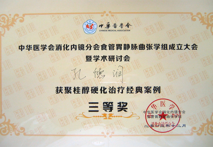 孔德润教授这次的演示病例,正是胃镜下硬化剂治疗抢救食管曲张静脉破裂急性出血,在云集北京、上海等地的全国近百家医院中脱颖而出,以第4名成绩荣获大赛三等奖,这是他连续三年获此奖项,得到大会主席令孤恩强教授的高度评价。