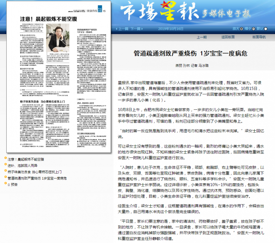 星报讯 家中出现管道堵塞后,不少人会使用管道疏通剂来处理,既省时又省力。可很多人不知道的是,具有强碱性的管道疏通剂使用不当极易引起化学烧伤。10月15日,记者获悉,安医大一附院儿科重症监护室就收治了一名因管道疏通剂引发严重烧伤入院一岁多的患儿小美(化名)。