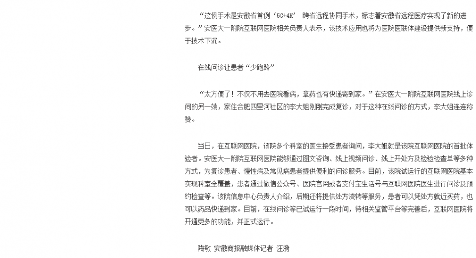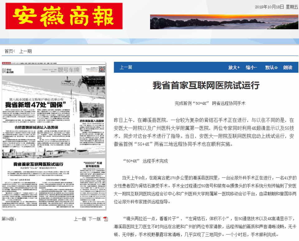 “这例手术是安徽省首例‘5G+4K’ 跨省远程协同手术,标志着安徽省远程医疗实现了新的进步。”安医大一附院互联网医院相关负责人表示,该技术应用也将为医院医联体建设提供新支持,便于技术下沉。