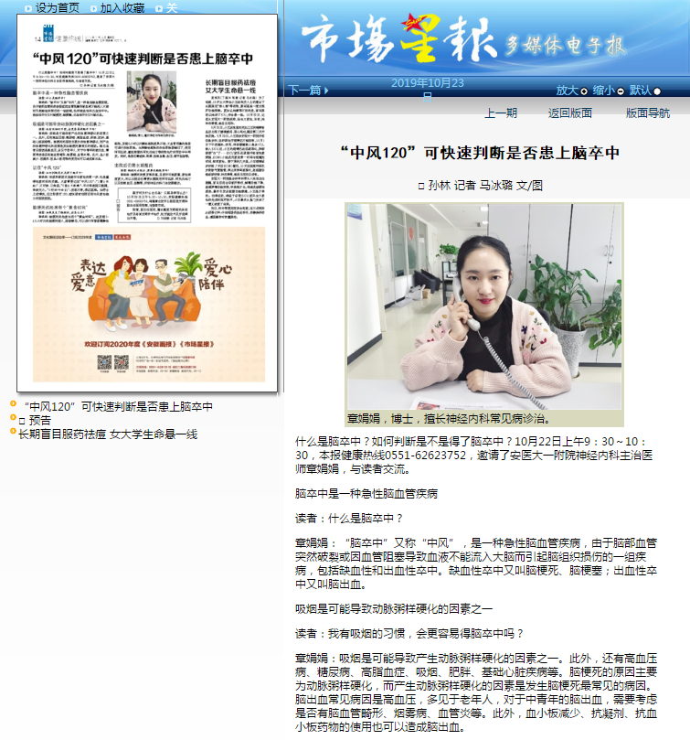 什么是脑卒中?如何判断是不是得了脑卒中?10月22日上午9:30~10:30,本报健康热线0551-62623752,邀请了安医大一附院神经内科主治医师章娟娟,与读者交流。