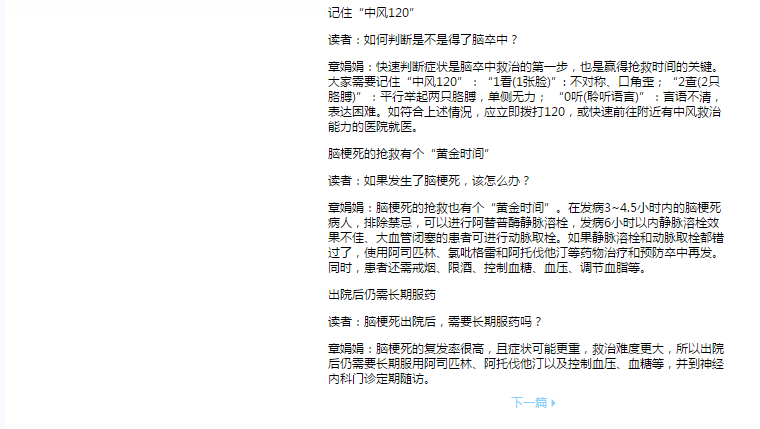 章娟娟:脑梗死的复发率很高,且症状可能更重,救治难度更大,所以出院后仍需要长期服用阿司匹林、阿托伐他汀以及控制血压、血糖等,并到神经内科门诊定期随访。